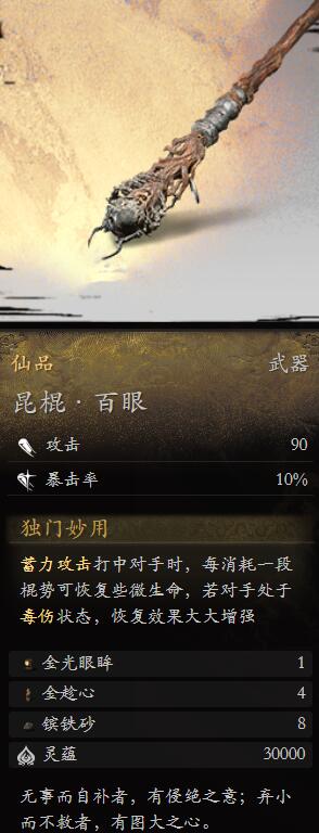 黑神话悟空昆棍百眼怎么样?昆棍百眼可以让玩家在攻击敌人的时候恢复自己的血量,能够极大的增加玩家角色的攻击力和暴击。是一个仙品级别的武器装备,这款武器装备是游戏中后期可以获取到的。