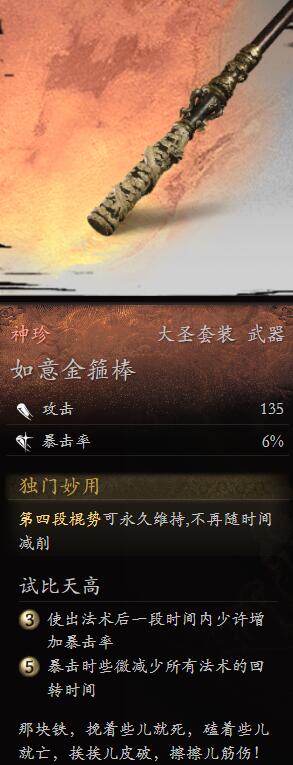 黑神话悟空如意金箍棒怎么获得?这是大圣套装武器,可以极大的提升攻击力和暴击率,在第四段棍势中可以永久持续不再随着时间消减。获取到大圣套之后,就能够通过剧情拿到。是很强大的武器。