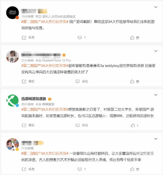 同时也有玩家表示希望是一些全新的内容或者成分,无论什么样类型的题材,国内玩家们都希望国产的3a大作能够像黑神话悟空一样传遍到世界各地,让大家对于东方的文化和神秘力量充满着好奇与期待。