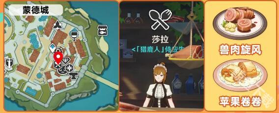 1、蒙德城找到猎鹿人萨拉可以购买:兽肉旋风、苹果卷。