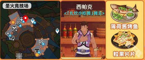 2、纳塔圣火竞技场小吃摊摊主西帕克可以购买:薄荷酱烤鱼、粒果片片。