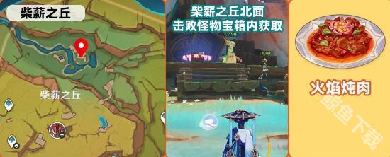 12、柴薪之丘北面,击败怪物宝箱之后,可以获得火焰炖肉。