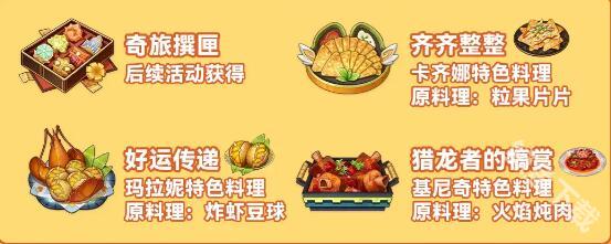 14、奇旅撰匣,后续活动获取。齐齐整整是卡齐娜特色料理,好运传递是玛拉妮特色料理,猎龙者的犒赏是基尼奇特色料理。