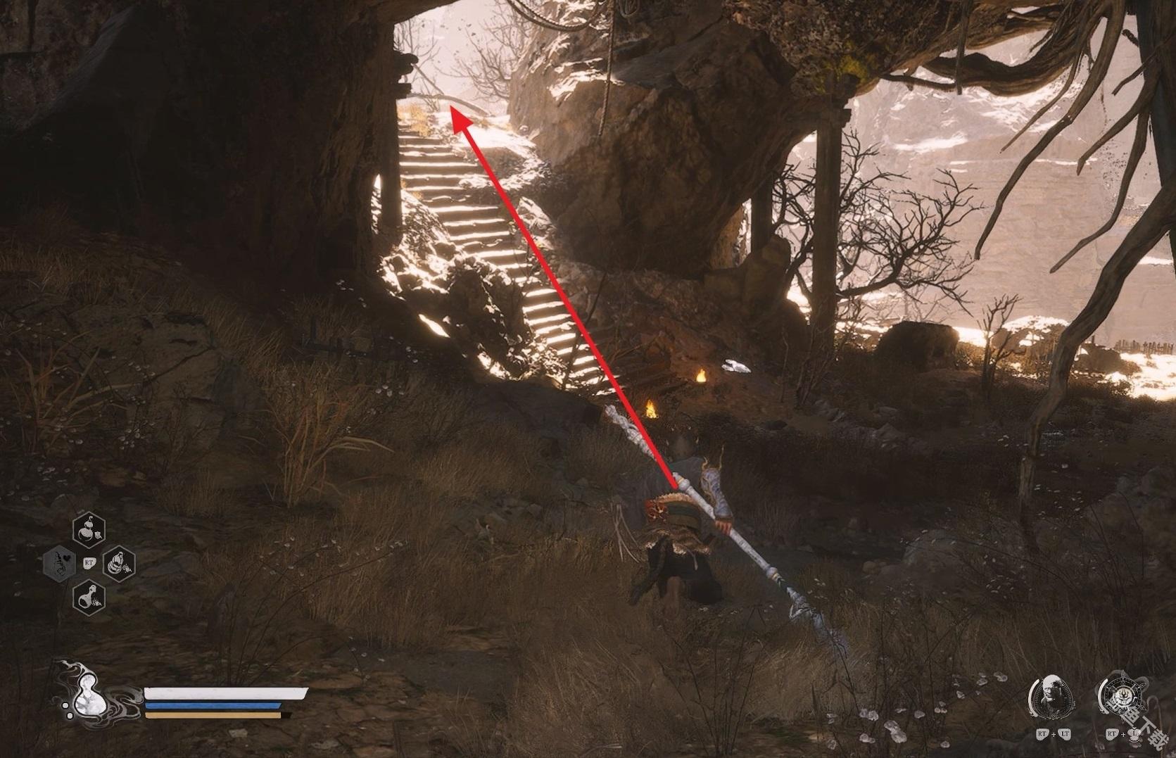 4、进入山洞后会有两条路给你选择,只需要走左边的楼梯上去就行