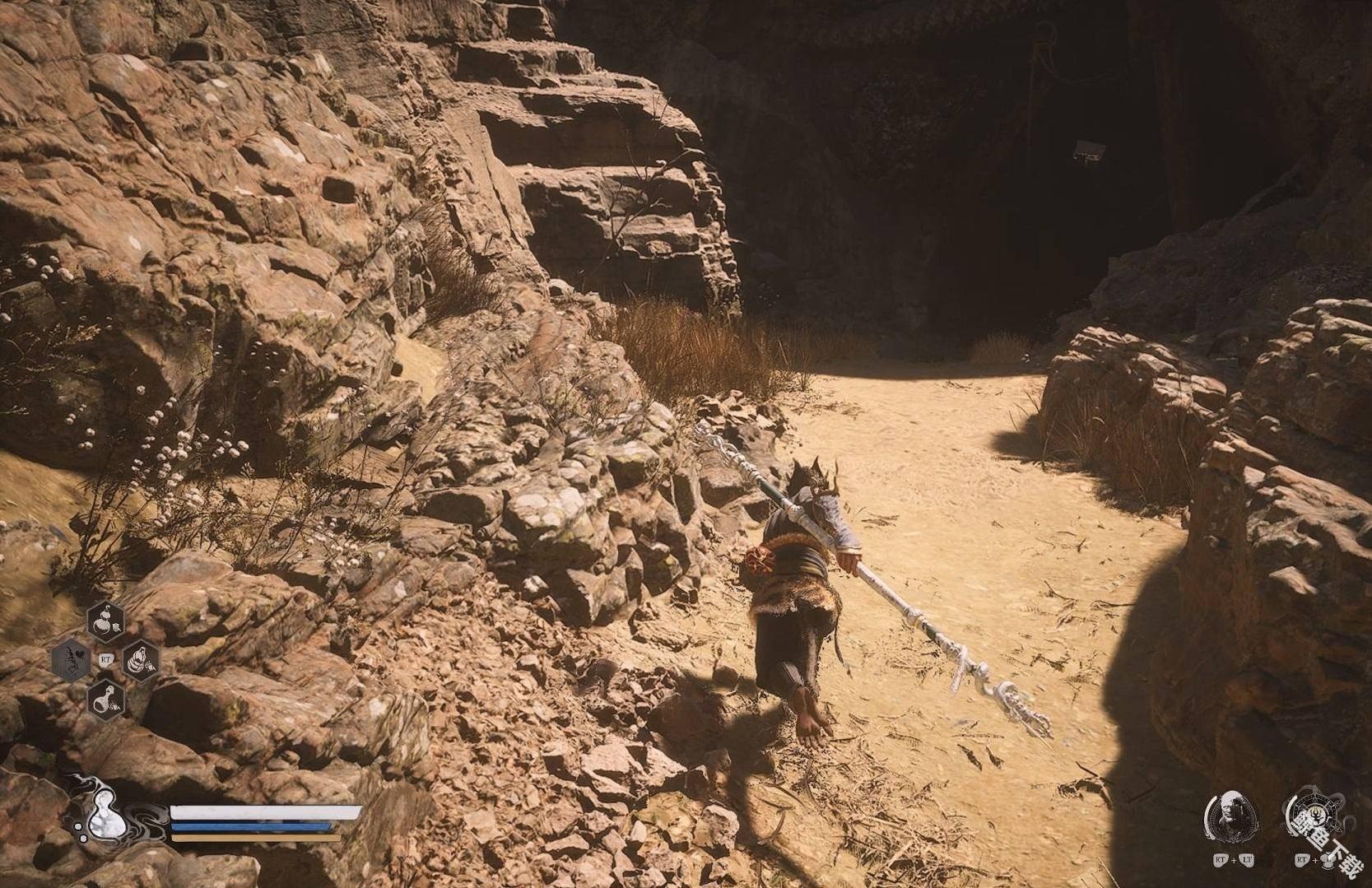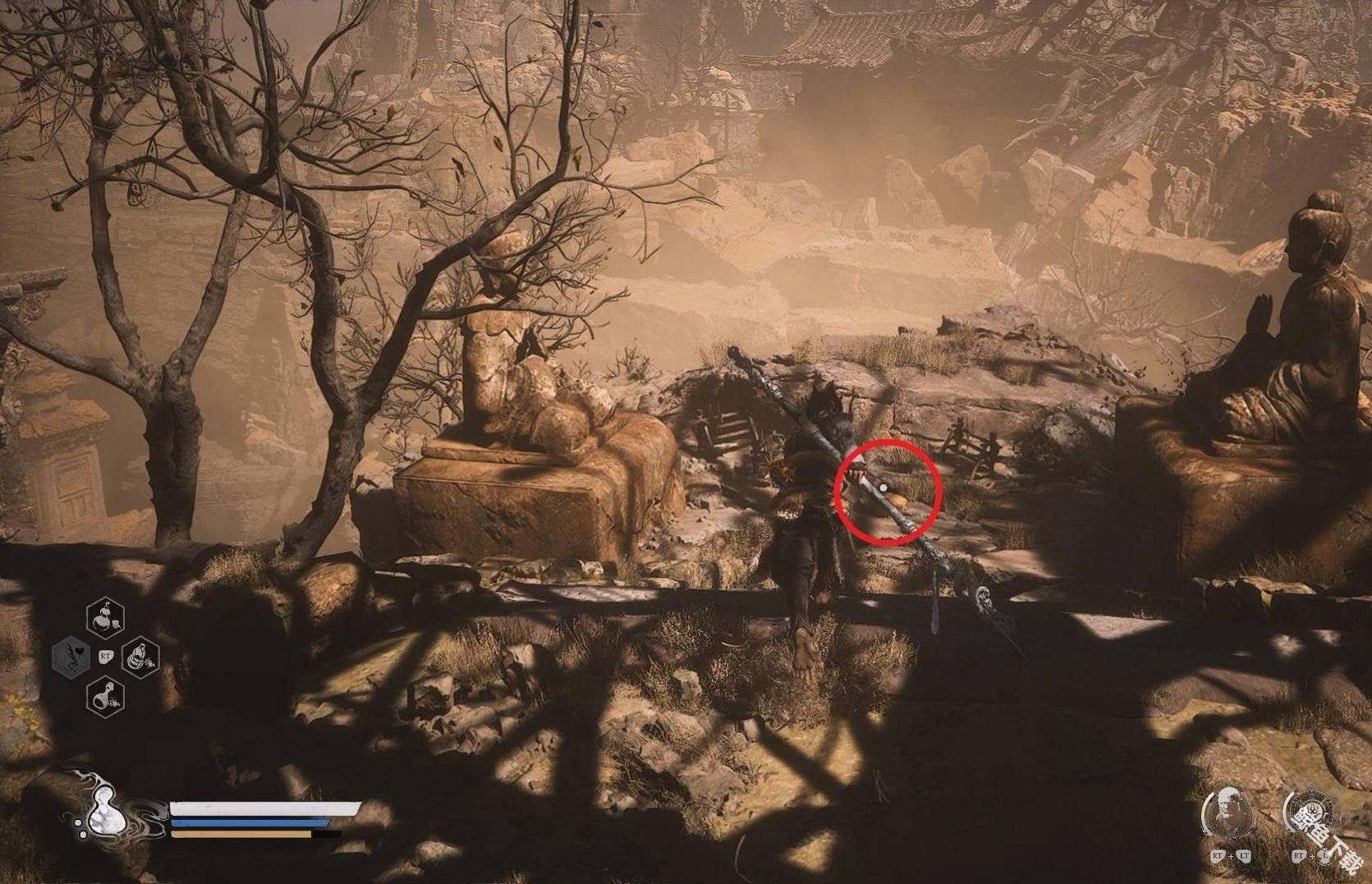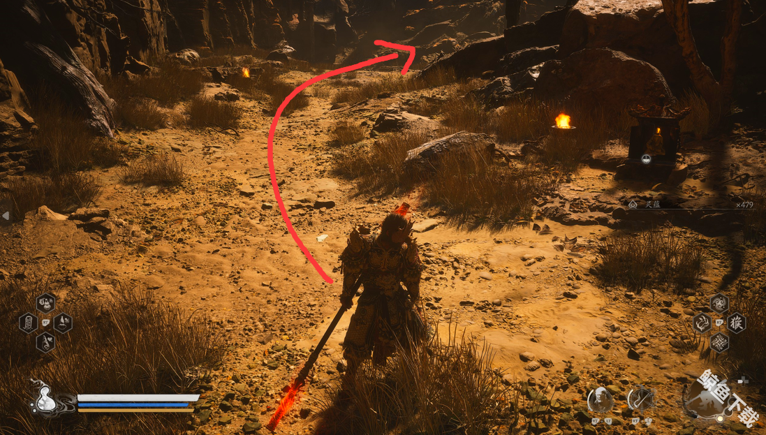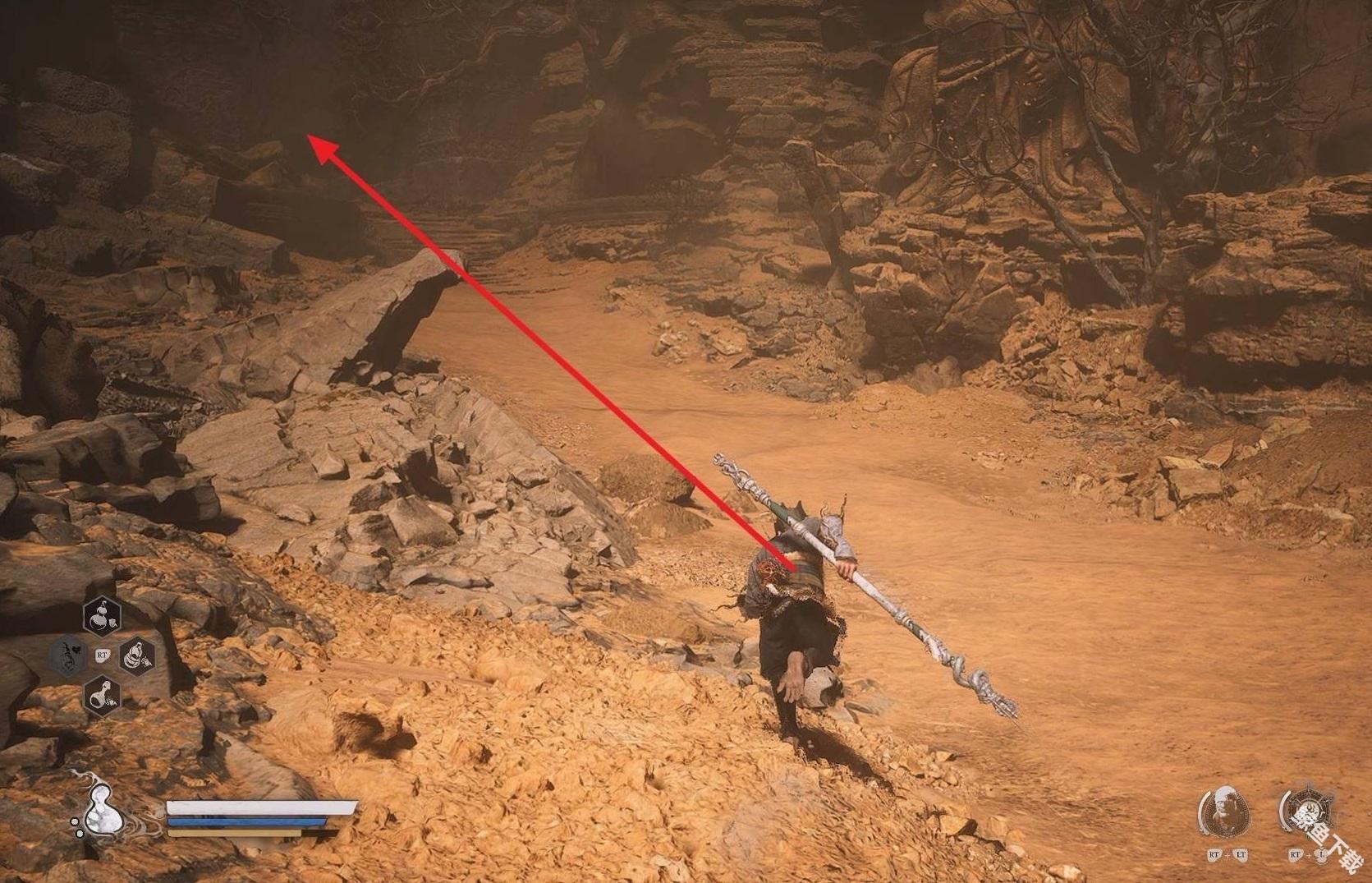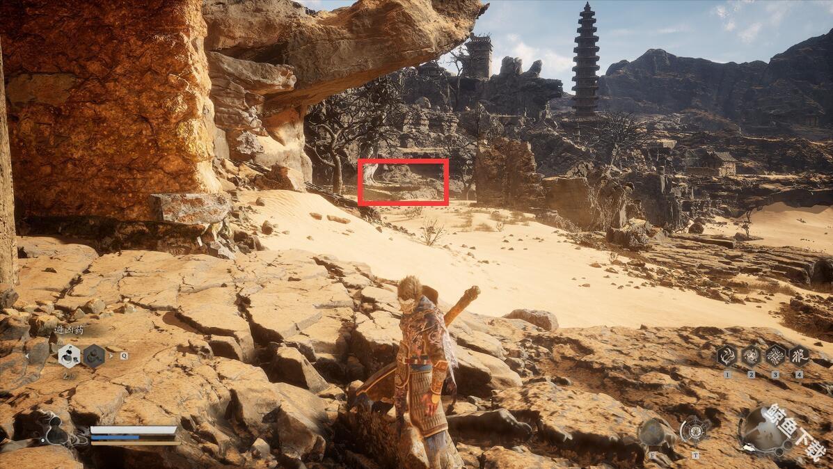 4、进入到这个缝隙之后一直往前走,左边红框的地方是【醒酒药】(后续解锁隐·嘶哈里国支线NPC黄袍员外),右边走到底回看到一颗歪脖子树,树下就是打坐蒲团