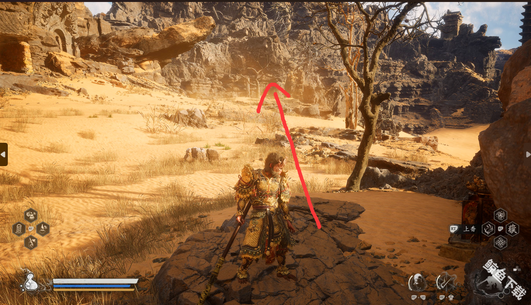 3、沿着地形中道路的位置往下走,会出现三条路的选择,正对面是【炼丹炉】的位置,右边是BOSS-【黄风大圣】,这时候需要往左边走