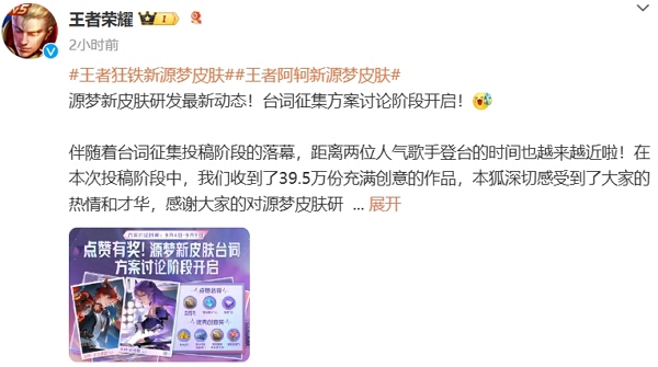 王者荣耀阿珂狂铁源梦皮肤制作进度再增加,当前官方已开启台词征集方案讨论,玩家可以对自己喜欢的台词进行点赞。