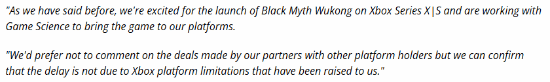 不过加载外媒很多都表示索尼于游戏科学所达成的某种独占协议,而且这些信息都是没有经过证实的。不过近期微软表示:“正如我们之前所说,我们很高兴在XSX|S上推出黑神话悟空,并正在与游戏科学合作将该作带到我们的平台。我们不想对我们的合作伙伴和其他平台持有者达成的交易发表评论,但我们可以确认延期并不是由于我们Xbox平台(性能)限制造成的。”
