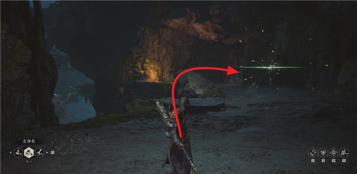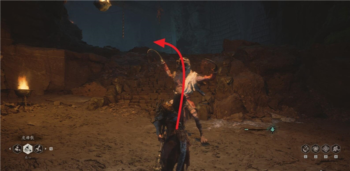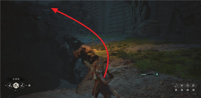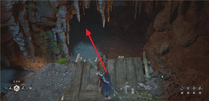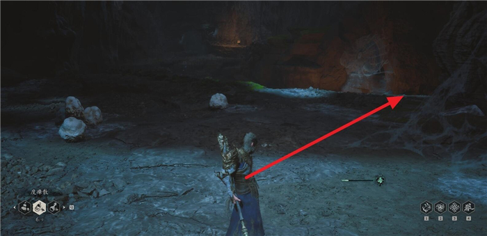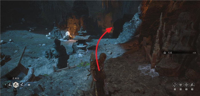 1、在第四章的盘丝洞上层的传送点,我们需要走土地庙正后方的斜坡上面,然后往下走,注意要贴着右侧的岩壁。
