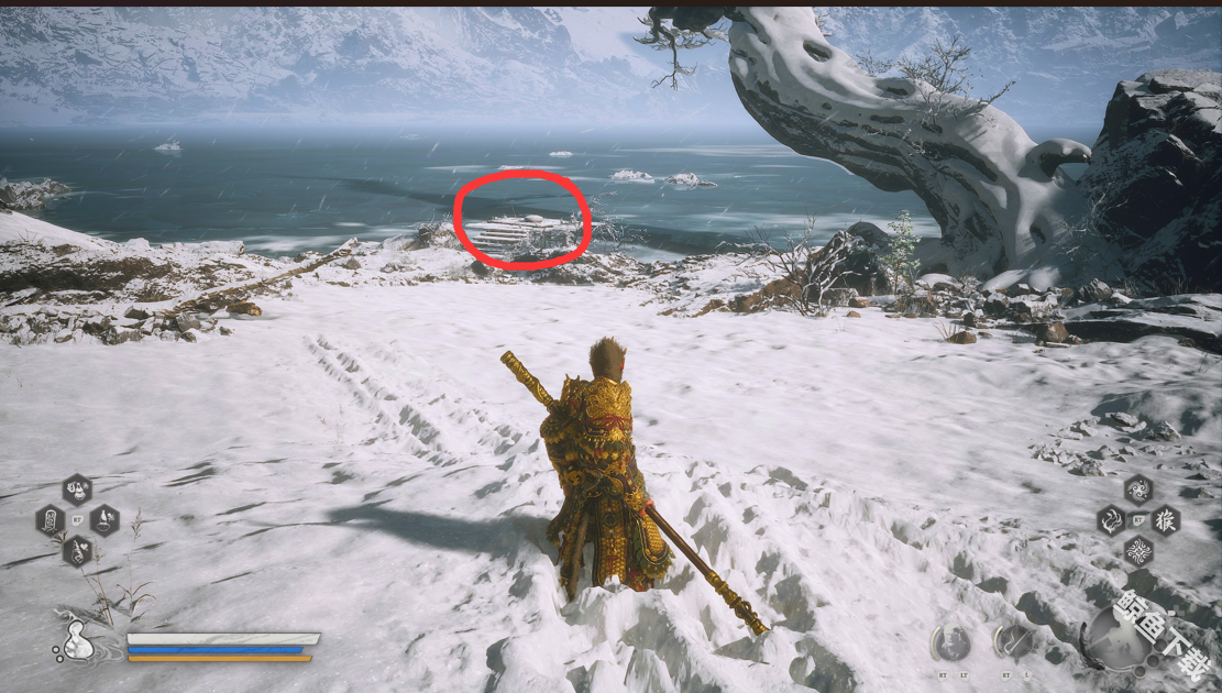 4、击败怪物之后,向冰瀑布的下方走,就可以看到打坐蒲团。