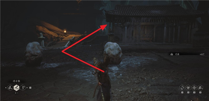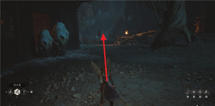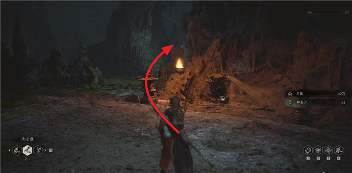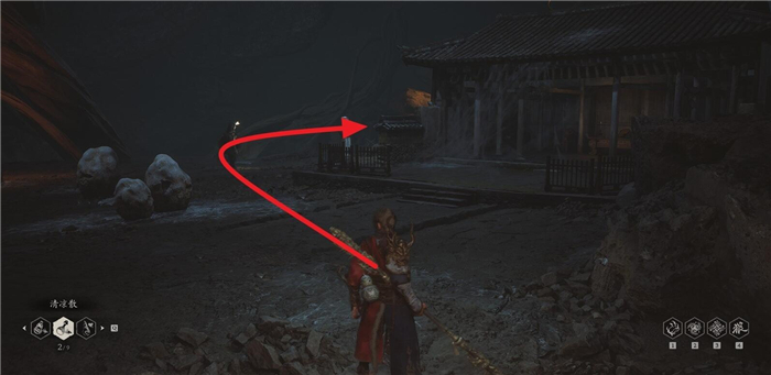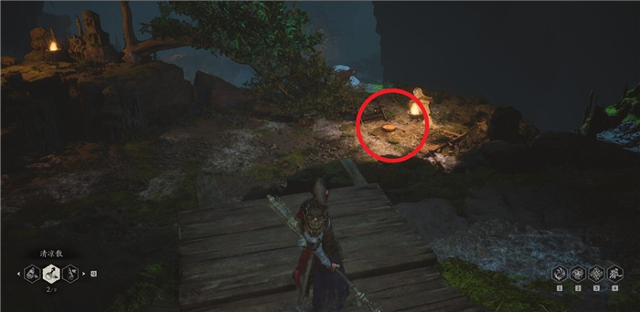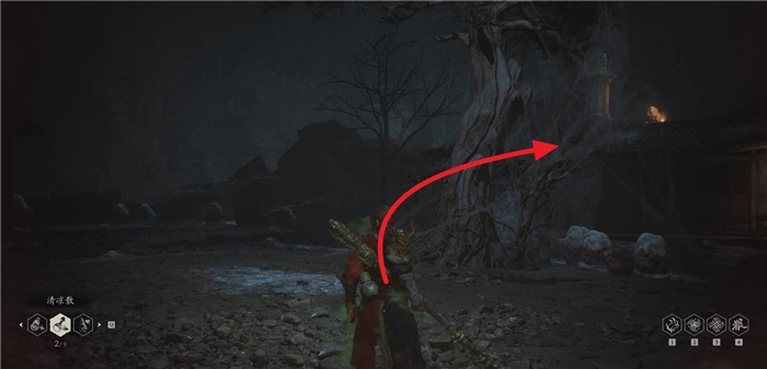1、从第四章盘丝洞的花间桥土地庙位置开启,面对存档点走到后面,遇见岔路口之后右侧。