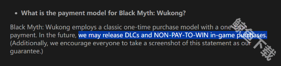 有部分细心的玩家们在黑神话悟空支付模式的问答当中找到一小部分的蛛丝马迹,游科官方表示,黑神话悟空将采用买断机制,未来可能会在游戏中提供dlcs中而非pay to win的内容。
