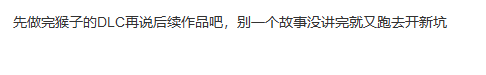 但又有另一部分的玩家表示道,希望先把黑神话悟空的dlc先制作出来,毕竟很多剧情还不是很完整的,把作品制作完整是第一大重要的情况。