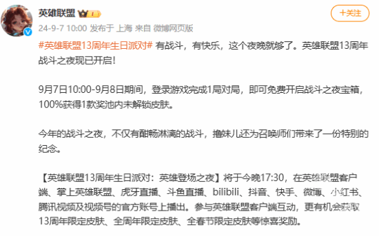 就在今天(9月7日)英雄联盟官方发文称13周年的战斗之夜已经开启。只要参与互动还有几位获得各种惊喜的奖励,小伙伴们还不快来看看。