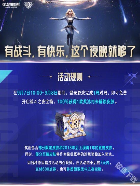 登录游戏完成一局对局,即可免费开启战斗之夜宝箱,100%获得一款奖池内未解锁的皮肤(有商城直售或者限定的皮肤)