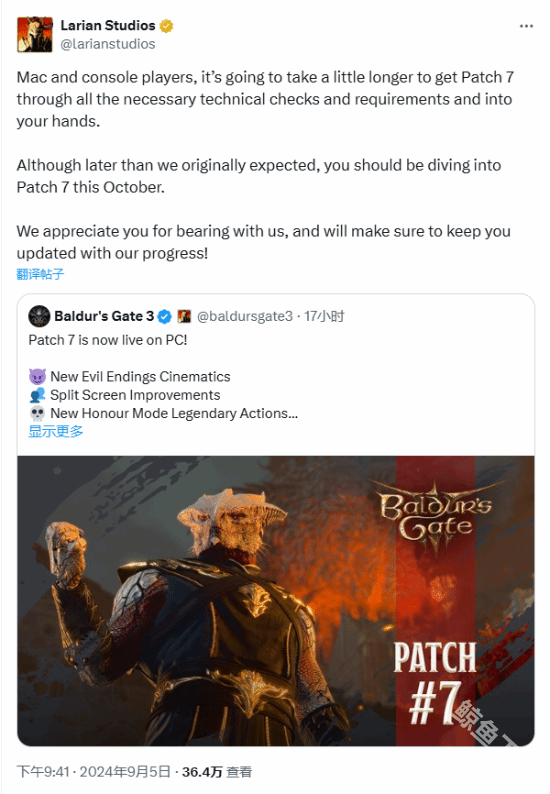 目前博德之门3的最新补丁7号补丁目前已经在pc端进行发布,pc玩家可以快速体验到最新补丁的内容,而且steam等一些pc平台已经可以下载更新了。就在最近,拉瑞安工作室宣布7号补丁的主机板和mac版需要在10月上线。