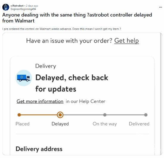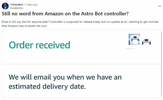 在国外的某论坛里,很多玩家都在说在一些知名的电商平台里自己购买的宇宙机器人限量版DualSense手柄的订单迟迟没有发货,甚至有的一些玩家被无缘无故的延期了,而且有玩家提前预购的也发生了类似于这种情况。
