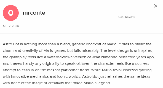 也有玩家表示宇宙机器人这款游戏就是山寨版的马里奥的游戏,而且玩起来平平无奇,就是在模仿马里奥的创意,没有任何原创新可言。