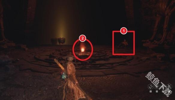 4、一直往左边的镜头有一快黑色的类似于宫殿的地方,往那个方向走,到大门的地方你会看到一团篝火,先和葫芦道士对话,然后与篝火对话,就可以获得你想要的【上清宝葫芦】了