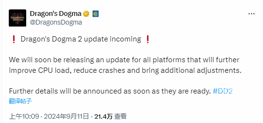卡普空宣布旗下游戏-龙之信条2全新的补丁正在开发,这款补丁可以适用于全平台,而且可以让玩家的电脑设备进一步的改善cpu负载,减少崩溃出现的情况和问题,并还有一些额外的调整。这一个补丁的详情会在之后正式上线前公布给玩家们,但是目前暂未公布上线的时间。