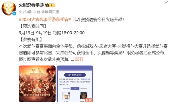 2024火影忍者手游秋季赛武斗赛预选赛在今日开启,玩家可前往游戏内参与报名。