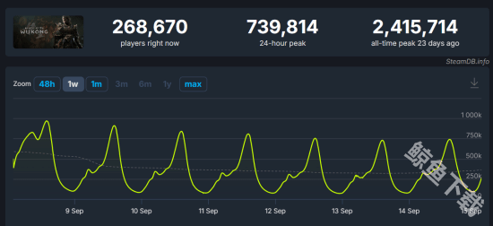黑神话悟空已经差不多发售了一个月的时间,目前这款游戏的steam在线人数每天都在缓慢下滑。根据SteamDB数据显示,这个游戏在中秋这个假期迎来了一个小反弹,目前这个游戏的在线人数也是超过了前一晚。