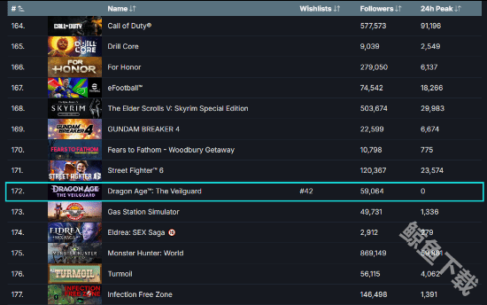 目前距离龙腾世纪4影障守护者正式发售还剩一个多月的时间了,目前游戏也是开启了预购的模式。根据SteamDB数据的显示,目前龙腾世纪4影障守护者在steam平台的的全球畅销榜单中目前的排名仅仅只排在了第172名。