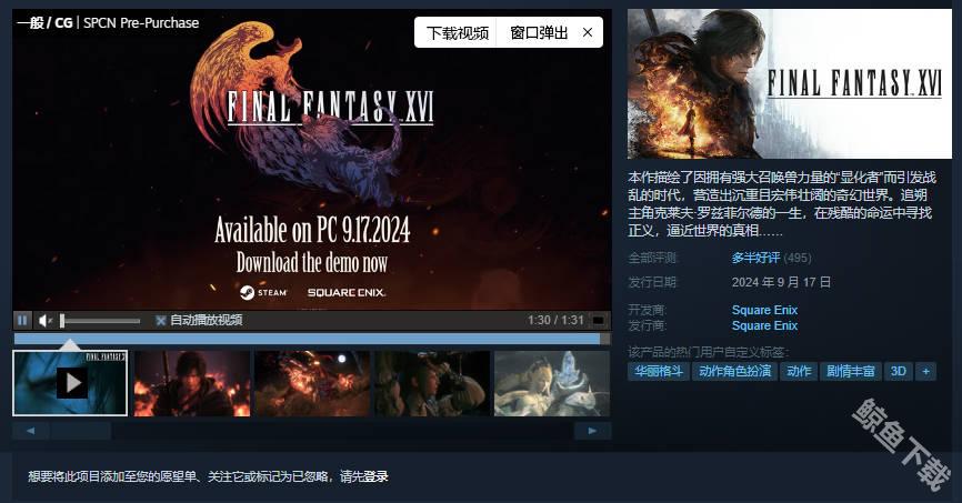 最终幻想16在2024年9月18日正式在pc端 steam平台解禁,这是最终幻想系列的第16部正统续作。游戏是以系列游戏共同的神话故事为背景,并在此基础上自由创作出的独立故事。这款游戏已经在去年(2023年6月22日)正式登陆PS5主机平台。