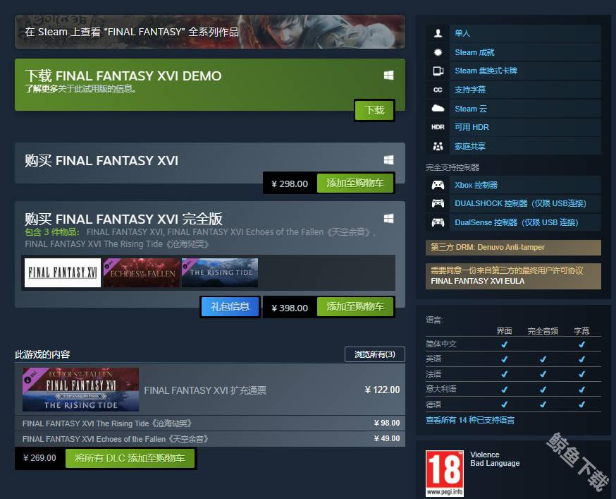 最终幻想16标准版298元,最终幻想16完全版298元(包含扩充通票和两个dlc :天空余音、沧海恸哭),游戏支持简体中文。
