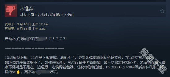 而且在pc端上动画到达30帧的时候会明显卡顿一下,而且d加密这个技术吃了很多玩家一大部分的帧数。还有些玩家先尝试了demo,但是一到正式版着色器编译完成就会闪退,然后重新进重新编译,还是进不去。