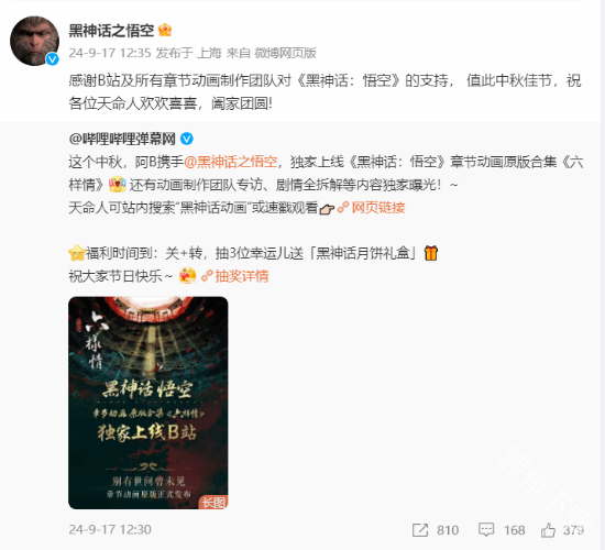 黑神话悟空章节动画--六样情已独家上线B站,黑神话悟空官方也是转发了其微博,并且感谢了b站及所有章节动画制作团队对黑神话悟空的支持。而且昨天正值中秋佳节,同时也祝各位天命人欢欢喜喜,阖家团圆。