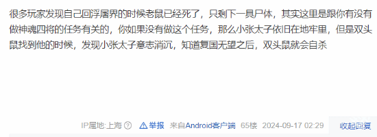 这个隐藏支线任务藏的非常的深, 就有玩家在评论区解释道,这个boss跟玩家做没做神魂四将任务息息相关,如果没做,小张太子就一直会在地牢里面,双头鼠找到他的时候会发现小张太子的一直小城,知道自己无望之后就会自杀;如果做了神魂四将任务,小张太子会离开浮屠界,双头鼠找不到以后会发疯并触发boss战。