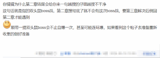 还有玩家表示在第二章的结尾动画中就明确的暗示给了玩家们,为什么第二章的结尾会来一句越搜仔细越搜不干净?这句话就是指的双头鼠boss战,而玩家如果在第二章的时候彻底搜干净了就完全不会触发这次的boss战,如果需要打就要在第三章解决完成后倒回第二章才可以。