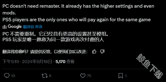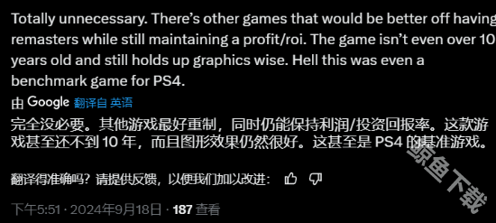 有的玩家表示:“感觉完全没有必要复刻,这款游戏发售到现在还没有到10年的时间,目前游戏的图形、画面效果依然保持的很好。“也有一部分的PC玩家表示:“认同完全不需要重置,原版的游戏已经具有非常高的设置选项了,还有各种高清的mod,只有PS5玩家会愿意为同一款游戏再次付费游玩。“