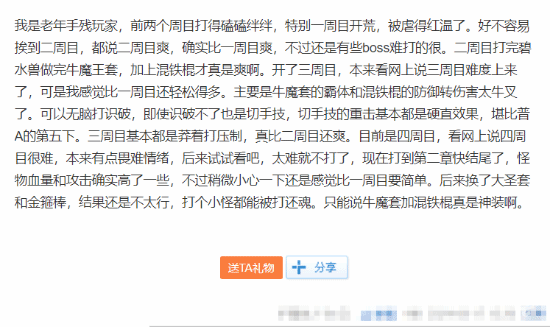 这名玩家自称自己是老年手残玩家,前两个周目打的磕磕绊绊的,特别是一周末的开荒的时候,就直接被虐的红温了。但是在昨晚牛魔王套以后就变得跟之前大不一样了,牛魔套的霸体和混铁棍的防御转换成伤害的时候兼职大牛了,可以无脑打识破,即使识破不了也是切手技,而且切手技的重击基本上都是比较硬的效果,能够堪比普通平a的第五下。三周目基本上都打压制的,比二周目还爽,目前在打四周目。