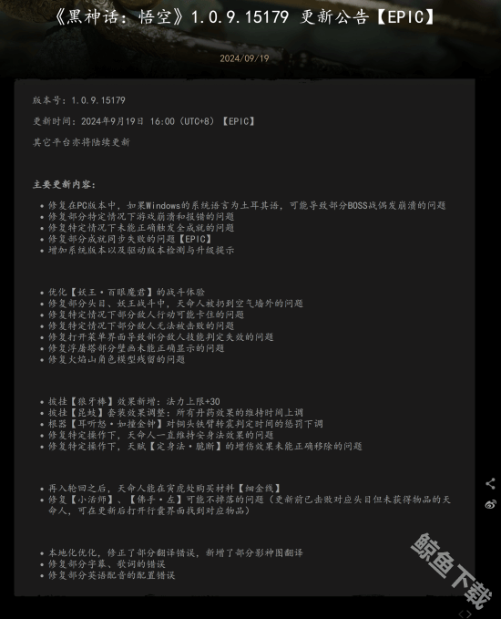 就在昨天(9月19日)黑神话悟空官方更新全新的1.0.9.15179版本,目前只更新Epic平台,后续的其他平台也将陆续更新。这一次主要的更新内容是修复游戏中存在的一些问题,并对一部分的优化体验进行调整和升级。