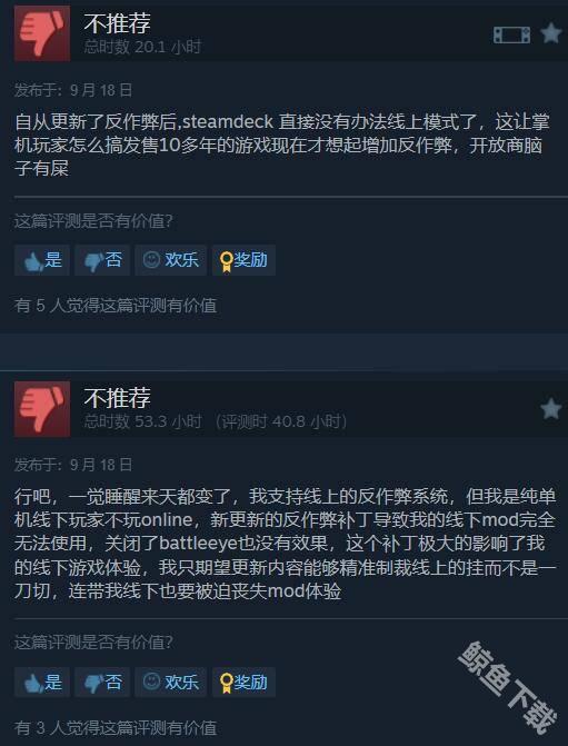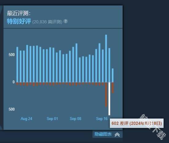 而这次在更新完成以后,这款游戏的steam在线玩家人数也下降、在最近的测评中新增了大量的差评。在图中就看到在9月18日一天就新增了602条差评,而大部分的差评都是针对这次BattlEye反作弊系统更新。