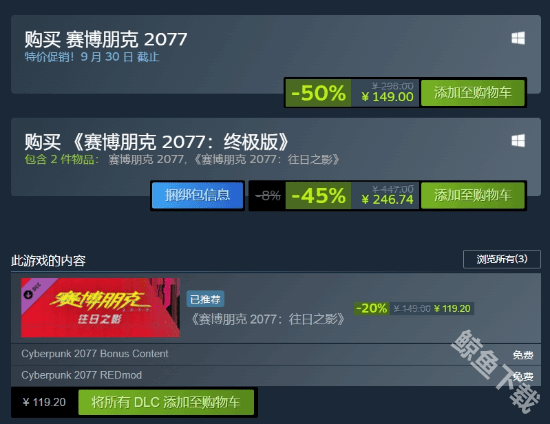 前几年非常火爆的游戏--赛博朋克2077目前正在steam平台进行史低优惠折扣,原本标准版售价298元,目前打对折仅需149元。原本包含赛博朋克2077dc的往日之影终极版售价为447元,目前折后价为246.74元。