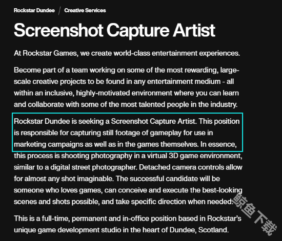 根据外媒的报道,有一名热心的玩家在论坛发帖表示,r星正在招募一名游戏屏幕截图捕捉艺术师,而且在这个职位的描述中写到,这个职位需要负责游戏中负责捕捉静态的画面,用于游戏的营销活动和游戏活动本身。同时还有一条快速掌握新游戏以及未完成的游戏,这里的未完成游戏可能是指r星还未发售的游戏--gta6。