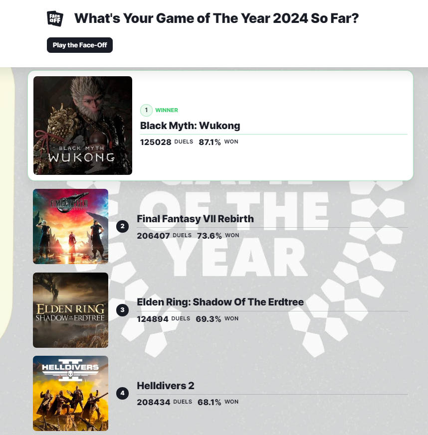 就在最近IGN官方发起了针对玩家对于2024年度游戏的征求意见,目前黑神话悟空凭借87%的支持率目前暂时登顶这个榜单的首位的位置。据悉这一次的投票环节是抽2款游戏并让玩家二选一的方式进行的,由此可见这部作品对于玩家们来说在心目中的重要性了。