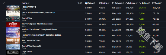 根据SteamDB数据显示,在前两天的周末,这款游戏的在线玩家峰值已经达到了35615名玩家,目前也是成功超越了往日不再,在steam平台中的ps游戏已经成功来到第八的位置,目前还有可能超越第七名的最后生还者第一部(36496人)。