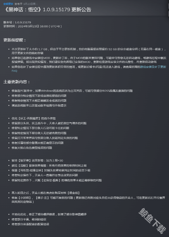 目前黑神话悟空在steam平台也迎来了1.0.9.15179的更新,本次补丁更新的大小约为1.7GB。由于steam平台的更新机制的问题,用户的电脑需要提前预留约92GB的空余空间(无需与游戏在同一个盘当中),用于更新文件的临时储存。