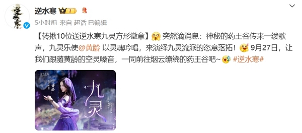 逆水寒不久前发布了有关九灵流派曲的最新消息,该歌曲将会在9月27日正式发布。