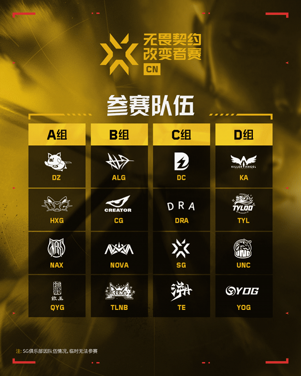 2024改变者赛CN赛区资格赛的参赛队伍经由各个合作平台选送,以及经平台承办的海选赛事选拔,DZ、HXG、NAX、QYG、ALG、CG、NOVA、TLNB、DC、DRA、SG、TE、KA、TYL、UNC、YOG共计16支队伍将进入2024改变者赛CN赛区资格赛的线上阶段。首轮揭幕战将在A组DZ、HXG、NAX、QYG四支队伍间展开。同时由于不可抗力原因,C组队伍SG临时无法参加比赛,本轮比赛判定为轮空。后续比赛信息请以官方发布为准。