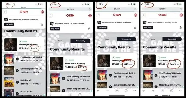 之前的第二名和第三名的数据没有特别显著的变化,但是数据和排名都有着小幅度的上涨,而且黑神话悟空与目前排名靠前的差距正在慢慢扩大。不过IGN官方和IGN高管针对玩家们的质疑进行了回应,全部都否认在暗中操作了投票。
