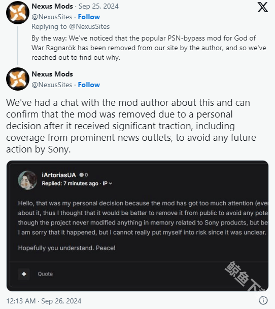 之前本站报道了n站下架了取消绑定PSN账号的mod,目前n站已经没有这款mod的任何踪迹,因为这款mod对于很多玩家们来说非常的实用,创建者iArtorias已从n站删除了这款mod。n站官方澄清这完全是作者本人的意愿,与网站无关。
