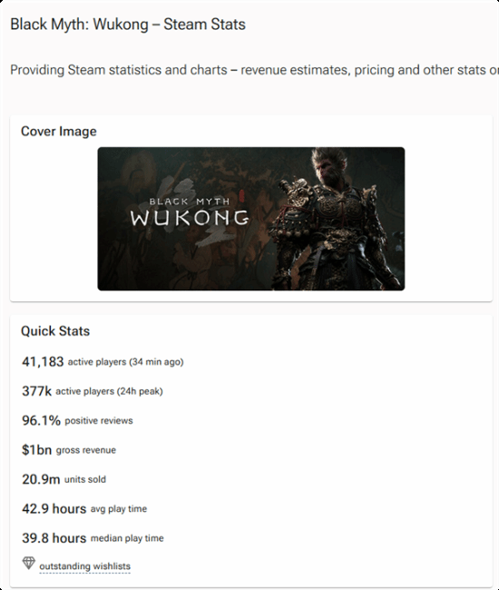根据国外的市场数据研究机构VG Insights最新数据显示,目前黑神话悟空已经在steam单平台总销量已经超过了2090万套了,单steam平台总收入已经超过了10亿美元(约合人民币70.1亿元),这一数据目前也是破了国内3A游戏销售的新纪录。