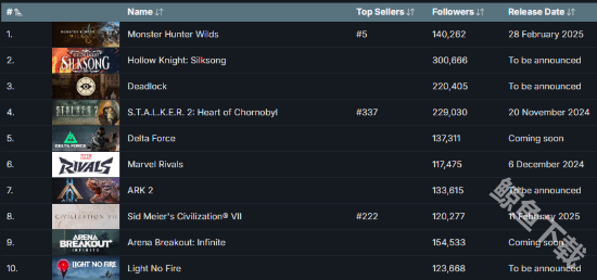 卡普空新作--怪物猎人:荒野在一系列的公开信息后,目前这款游戏已经登上了steam平台的愿望单第一名的位置,根据SteamDB数据显示,目前关注这款游戏的玩家已经多达14多万名玩家。