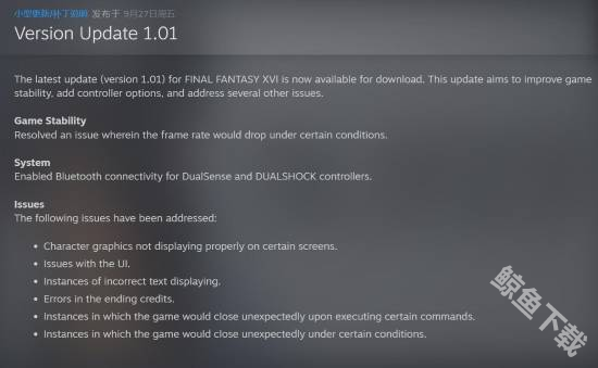 最近最终幻想16推送了首个PC端的更新1.01的补丁,这一次补丁中可以为玩家们提升更好的游戏稳定性、手柄选项等,并顺利解决其中几个bug问题。不过这一次更新可以在游戏特定的情况下提高画面帧数表现,这一次的更新适用于Steam和Epic游戏商城的玩家。