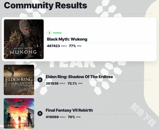值得注意的是,艾尔登法环DLC黄金树幽影和最终幻想7:重生分别以72.1%和70%的支持率排在第二位和第三位。这些数据表明黑神话:悟空不仅在市场上获得了巨大成功,而且受到了玩家们的热烈欢迎。